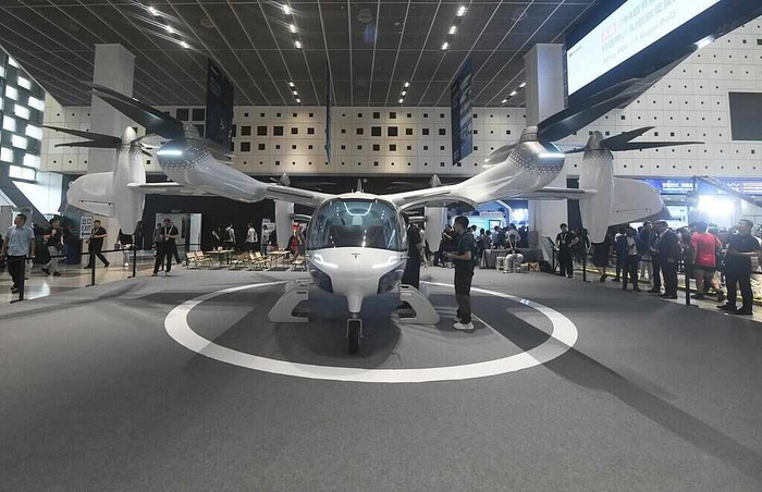 2025年7月26日,观众在2025世界人工智能大会上参观时被誉为“空中的士”的E20电动垂直起降飞行器(evtol)(图自视觉中国)