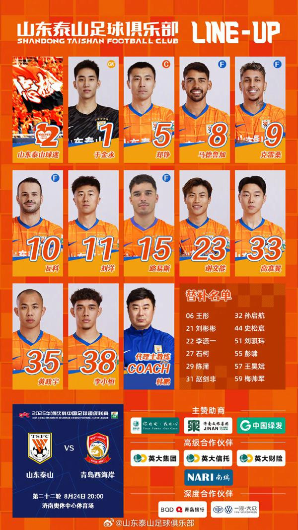8月24日晚8点,中超第22轮上演“齐鲁德比”,山东泰山主场迎战青岛西海岸,韩鹏与邵佳一的少帅对决备受关注。比赛第7分钟,克雷桑破门,终结进球荒。第23分钟,郑铮染黄,下轮踢国安将停赛。第49分钟,克雷桑任意球世界波破门。第58分钟,阿齐兹扳回一球。第59分钟,瓦科建功,再次扩大比分优势。第78分钟,阿齐兹也完成梅开二度。最终,泰山3比2力克西海岸,收获三连胜。